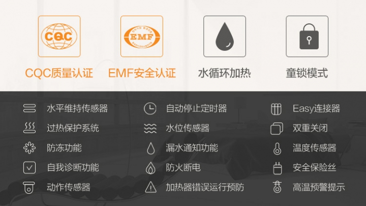 无电辐射认证、多重安全保护系统、人性化童锁杀菌功能等一应俱全,是爱护自己及家人健康,提升生活品质的高端床上取暖水暖床垫。