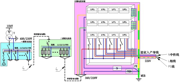 我们看到,来自于二级配电设备的居家配电电缆2的电能被送到左下方的计量电度表箱的入口处。